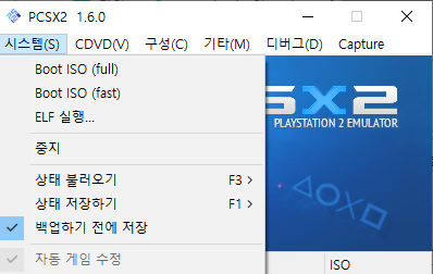 시스템을 눌러 boot iso를 눌러주면 게임이 구동됩니다.