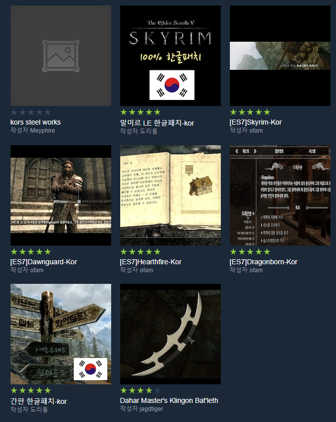 이 중에서 말미르 LE한글패치와 [ES7]skyrim-kor이 가장 유명한 한글 패치인데요.