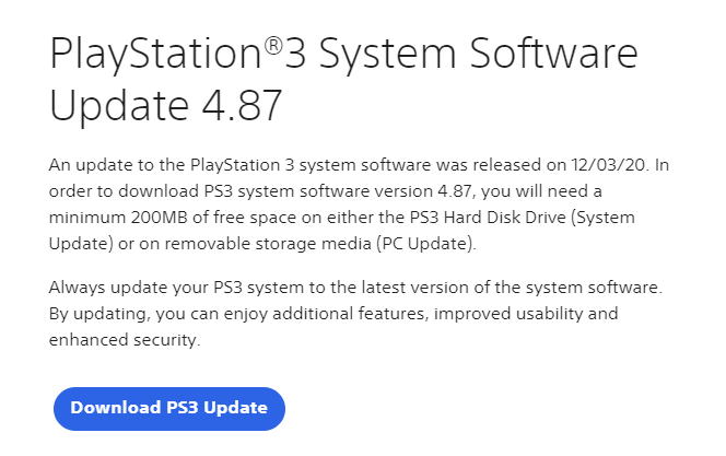 PlayStation®3 System Software Update 4.87 An update to the PlayStation 3 system software was released on 12/03/20. In order to download PS3 system software version 4.87, you will need a minimum 200MB of free space on either the PS3 Hard Disk Drive (System