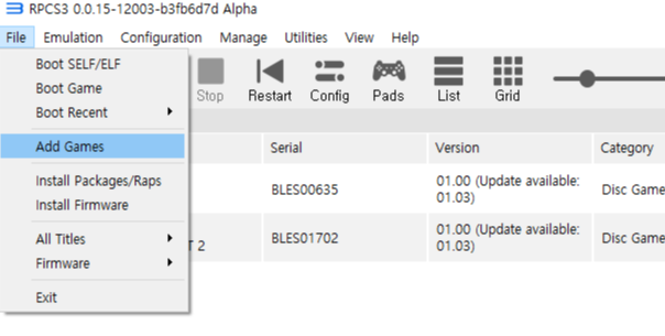 혹시 pkg형태의 파일이라면 add games 바로 아래 install packages/Raps를 선택하여