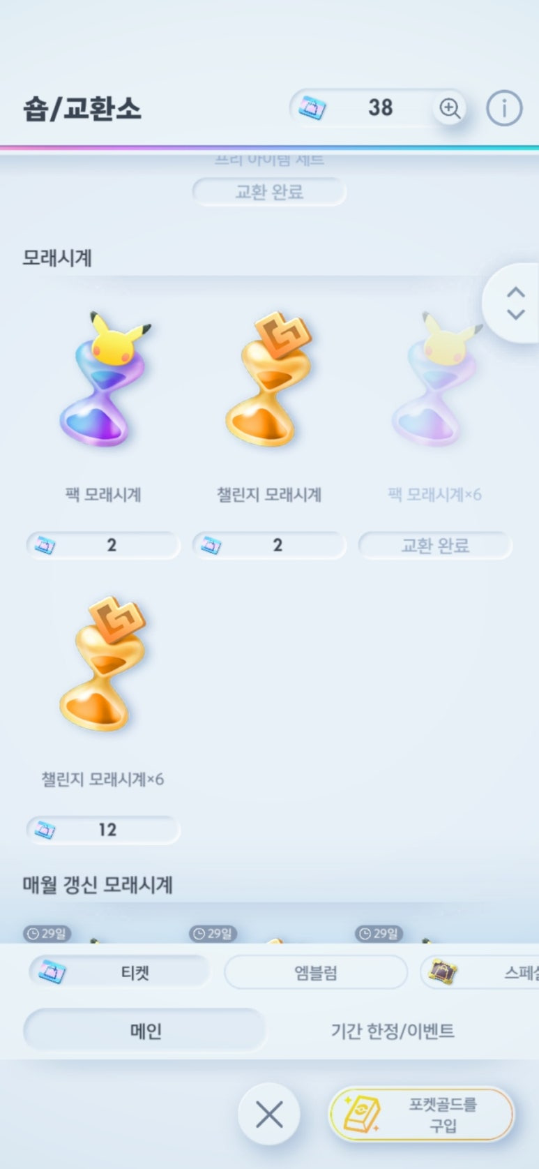여기서 얻은 재화는 숍에서 팩 모레시계로 교환이 가능합니다. 120개 모이면 바로바로 10팩씩 개봉해줍니다.
